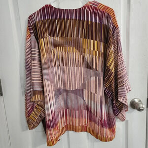 Elevate your wardrobe with this stunning CAbi kimono in a beautiful striped pattern. The 3/4 sleeves and relaxed fit make it perfect for any occasion, whether you're traveling, attending a party, or just running errands. The multicolor design features geometric and artsy vibes, adding a bohemian touch to your look.
