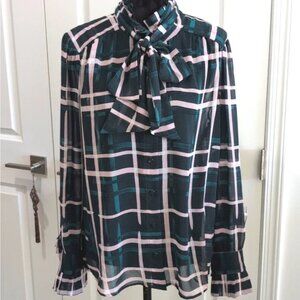 Green Plaid Ruffle Blouse w/Neck Sash that can be tied in a large bow or removed for a different look