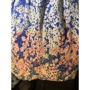 The product is a CAbi top in size small, featuring a v-neck tunic style with dolman sleeves and a tie front closure. The top is designed in an artsy floral boho style, perfect for casual occasions. Made of lightweight rayon material, this relaxed fit top is suitable for regular size women looking for a stylish and comfortable addition to their wardrobe.