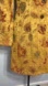 Goldenrod harvest gold, golden mustard yellow tapestry jacket with burgundy, green and brown floral print.