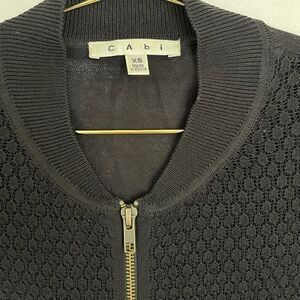 Beautiful bomber style zip up sweater from CAbi, size XS. Featuring delicate patterned lace fabric to the front, with a lightweight almost sheer knit throughout the rest of the sweater, & exposed zipper/zip up front. This is in like new condition with one flaw cut/rip noted to the left cuff (see photo/video); this could most likely easily be sewn shut. Beautiful sweater! Selling as is ✨
