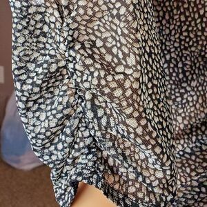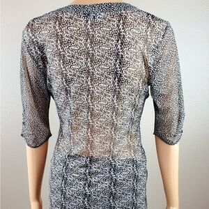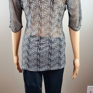 (BB) CAbi Black and Gray Sheer Animal Print Top. 3/4 Length Sleeves with ruching. Pretty Ruching down the front.