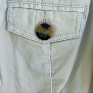 CAbi Kenya Safari Off-White Jacket/Coat NWOT Size Medium. This is a slim fit topper in a off-white color, has pocket detailing with safari-inspired tortoise buttons, done in a stretch-canvas fabrication, hits at the low hip, has long sleeves with cuffs & removable epaulets. Elastic at back of waist for stretch and