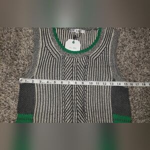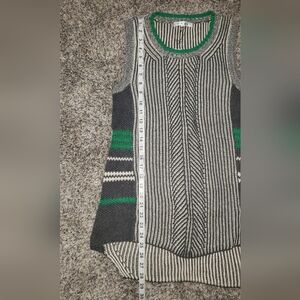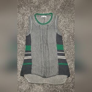 Stylish sleeveless top with a mix of gray and green stripes. Features a unique pattern and comfortable fit. Perfect for casual wear.