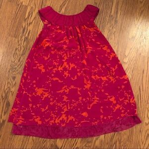 Blouse has 2 layers of flowy sheer chiffon fabric. Bottom layer has a pink tie dye look and the top layer is hot pink and with an orange abstract design. Neckline is folded grosgrain ribbon.