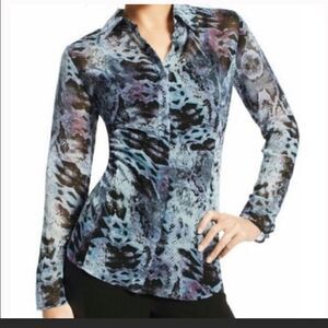Classic blouse by Cabi. Snakeskin pattern. Lightweight. Hidden buttons. Darts for a flattering fit. 100% polyester.