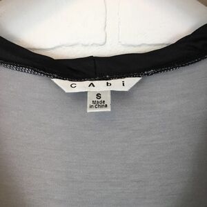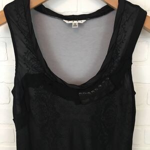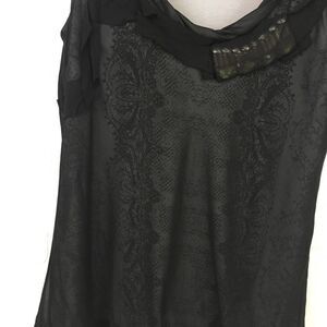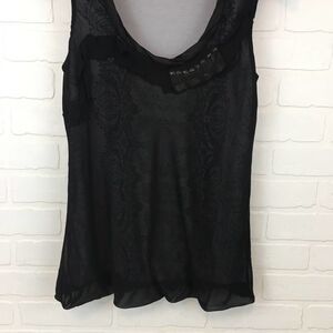 Size Small. Cabi Sleeveless Bubble Hem Top. Features ribbon and embellished details and a sheer overlay with a patterned base layer.
