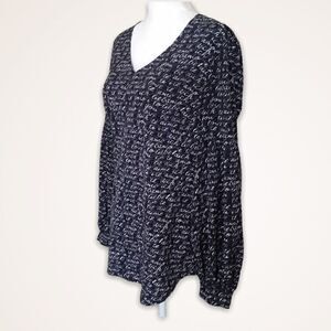 Beautiful v-neck blouse with balloon sleeve, romantic scrip spelling out I love you in various languages. Popover style.