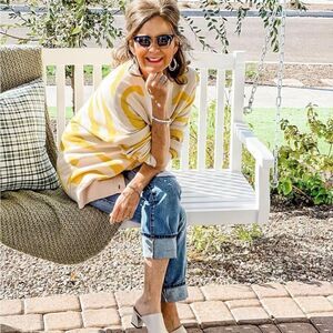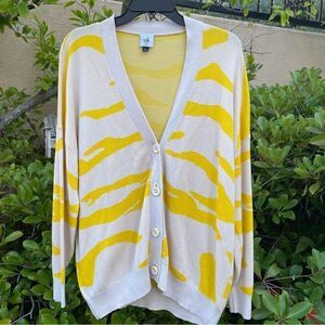 CAbi Roar Button Down Cardigan Yellow Animal Print. Size XS. NWOT. Beige and a beautiful yellow animal stripe. V-Neck with ribbed detailing at hem and cuffs. Oversized shape and drop shoulders. Great to just throw on and go! Ships from a smoke and pet free home.