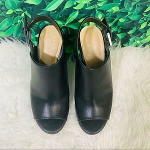 Apt.9 Black Faux leather peep toe shoes size 8.5. These were only used twice and only flaw it’s a little scuff barely visible shown in pictures. Excellent used condition! Block heel. Chunky heel. Peep toe. Open toe. Casual outfit, party outfit. Perfect for any special occasion such as birthday, work, graduation , baptism, or the upcoming holidays such as Christmas, xmas , new year and thanksgiving. Perfect colors for fall and winter. Casual. Party. Christmas eve, holidays, party. Summer, spring, birthday, celebration, casual, work, school, edgy, boho.
