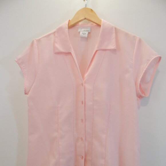 C.B Collections Soft Pink Button Blouse beautiful shade of pink with handmade eyelet details around collar, sleeve's, front and hem all around Size Medium preowned but in like new condition no damages or stains perfect for the office.