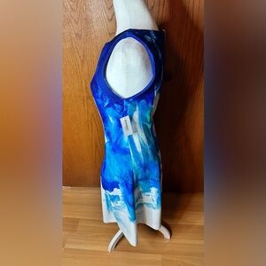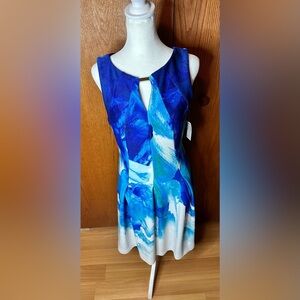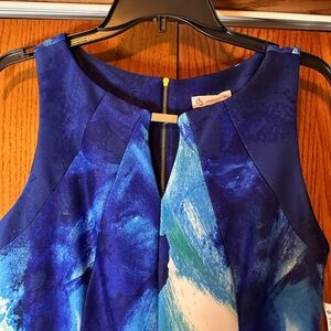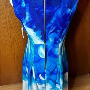 This stunning CB Established 1962 dress is perfect for any occasion. The aqua blue watercolor pattern is eye-catching and the pleated accents, buckle, and zipper add a touch of elegance. The fit and flare style is flattering for all body types and the knee-length dress is great for the summer, fall, and spring seasons.