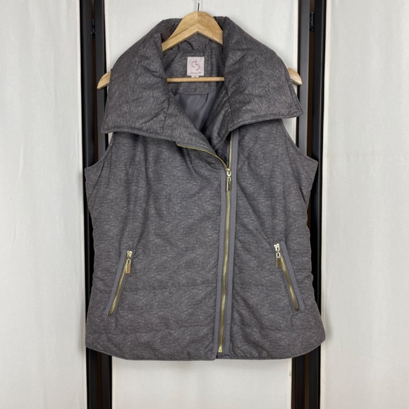CB Established 1962 Deep Warm Gray Moto Style Fitted Puffer Vest, Asymmetrical Gold Zipper, Slash Zipper Pockets, Shoulder Stitching Detail, Super Puffy SZ M Pit-to-Pit 21”, Should to Hem = 26”, Casual, Weekend, Fall, Funnel Neck, Sporty, Comfortable, Warm