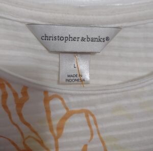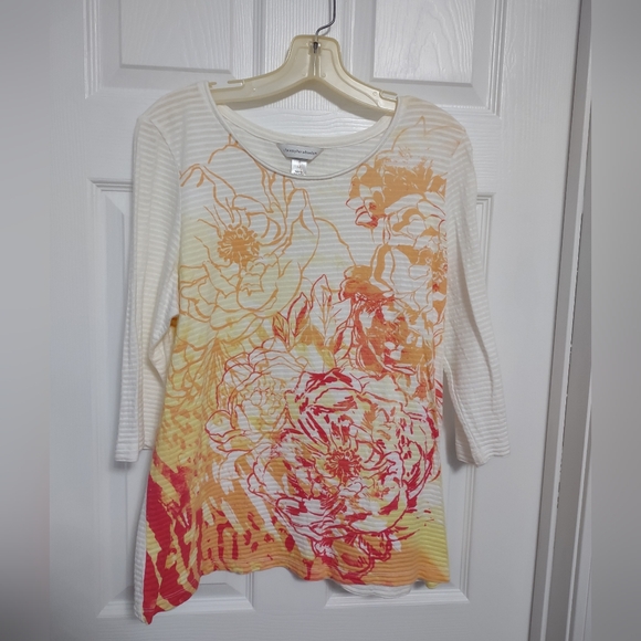 Pretty floral print 100% cotton top. Pullover top with 3/4 sleeves. The material has a shadow stripe texture. Size is large: measurements are 20" across from armpit to armpit. Length from the shoulder is 26". Very gently worn. From a smoke free home.