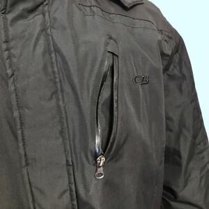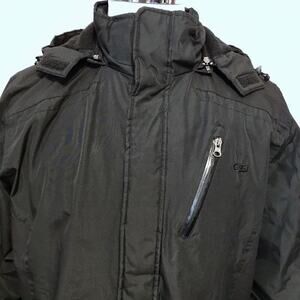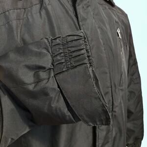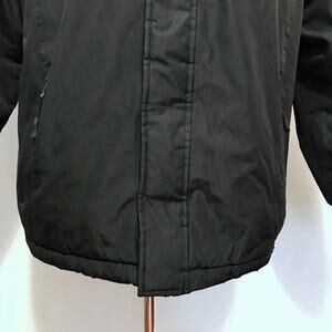 Excellent condition. Black Puffer Jacket for Men Size L. Zipper and velcro for closure, 1 top left chest pocket with zipper, 2 front pockets with zippers, long sleeves, elastic cuffs with adjustable velcro, removable hood, internal snap button fastener as shown in pic, adjustable bottom hem, 1 internal pocket with fasteners. Pictures are part of description.