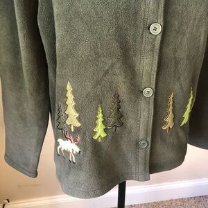 C&B Sport Fleece Button Up Sweater. Outdoor winter vibes - Pine trees and moose. Excellent preowned condition. Super soft, dark olive green color.