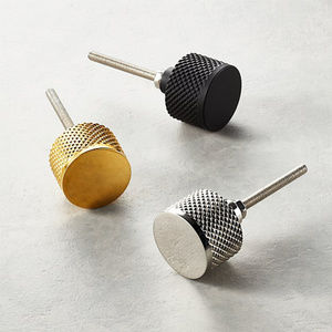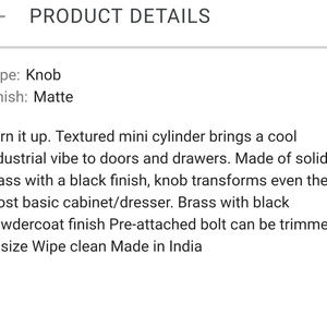 Turn it up. Textured mini cylinder brings a cool industrial vibe to doors and drawers. Made of solid brass with a black finish, knob transforms even the most basic cabinet/dresser. * If you need more than 4 please reach out to me and I may have some in stock.
