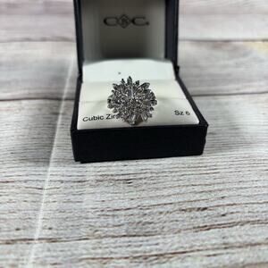 CBC Cubic Zirconia Womens Size 6 Ring. Ring is still connected to the box, but the box is broken on the back and hinge. The inside of the box has discoloration. Please see all pictures for reference and condition