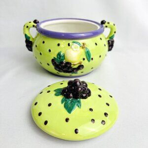 This charming ceramic pot features a vibrant green body adorned with black polka dots and a purple rim around both the lid and the base. The lid is topped with a cluster of raised ceramic grapes, serving as a handle. The pot is decorated with painted raised pears and bunches of grapes. A delightful piece for decorative purposes or serving food with a touch of whimsy.