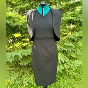 This sleek and classic black dress features an attached cape and gives an elegant look.