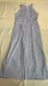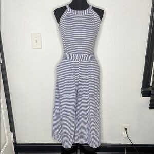 The jumpsuit is sleeveless with a halter neckline and wide legs, and it appears to have pockets. It is made of a lightweight fabric. Elevate your style with this chic striped halter jumpsuit. Featuring a flattering blue and white pattern. Worn with your favorite summer sandals. Has a zipper in the back, waist straps & side slant pockets.