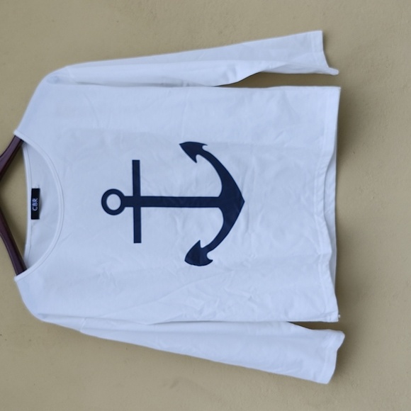This relaxed long sleeve tee from CBR features a striking navy blue anchor graphic on a crisp white background. Crafted for comfort, it offers a soft, lightweight feel perfect for casual wear. pit2pit 20" large 23"