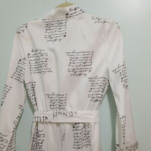 Shoulder to shoulder is 15 inches, armpit to armpit measures 18 inches, waist is 25 to 31 inches depending on the stretch, rise is 12.5 inches and the inseam is 30 inches. Leg width is 10.5 inches. Side pockets, belted. I have no idea what is written on it. It is written in a foreign language. NWT. It is see through. It would be great as a swim suit cover up. Open to reasonable offers.