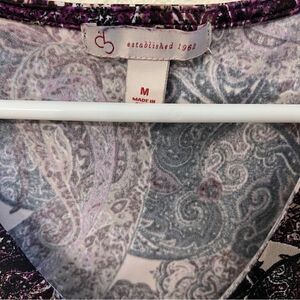 This fun sleeveless top is from CB. The item has a purple paisley pattern. The top’s front is also layered. (see photo) The body is made from 96% polyester and 4% spandex. The lining is out of 100% polyester. The size is medium. The measurements are 24” L x 19” W (pit to pit). This top has been gently worn but is in very good condition.