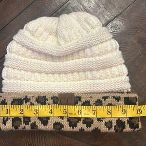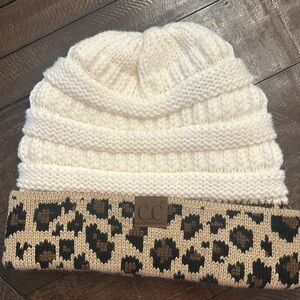C.C. Brands Women's Cream with Leopard Print Cuff Knit Beanie