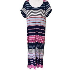 This C&C California striped maxi dress combines casual style with comfort, featuring vibrant navy and pink hues. Short sleeves and a relaxed fit ensure ease of wear.