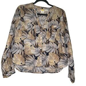 C&C California 100% Linen Leaf Print Roll Tab Long Sleeve Button Up Shirt Tan Size Small