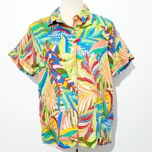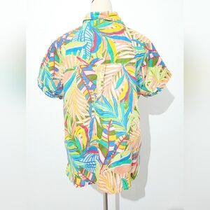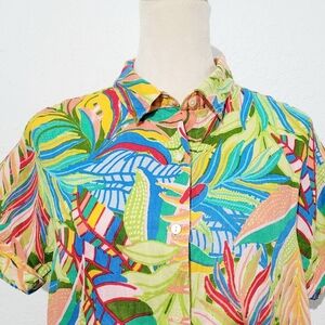 Bright and bold C&C California linen shirt featuring a vibrant tropical leaf print in multicolor. Made from 100% lightweight linen, this short sleeve button-up is perfect for warm weather, vacations, or casual summer wear. Comfortable, breathable, and stylish.