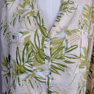 C&C California 100% Linen Tropical Botanical Print Buttons Roll Sleeve Blouse Size L