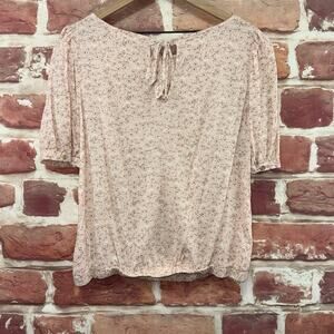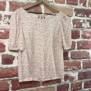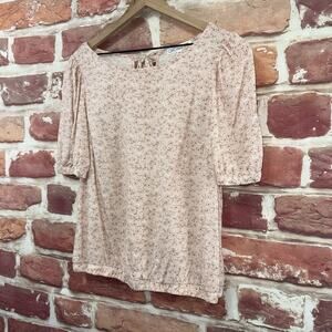 ▪️ Women’s top: Scoop neckline, pullover, floral abstract pattern, elasticized waistline, peephole tie up nape, and short sleeves. Pre-owned. Wear it with your favorite outfit!