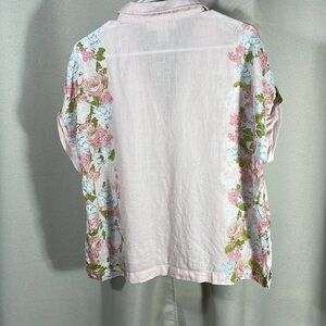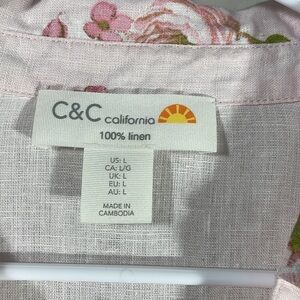 Elegant floral linen shirt by C&C California. Features pink and green floral patterns.