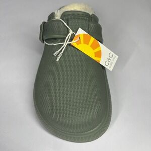 # C&C California, clogs, slides, fuzzy lined, sherpa lined, adjustable buckle, olive green, comfort shoes, indoor shoes, outdoor shoes, slip on shoes, casual shoes, women's shoes, size 7, size 8
