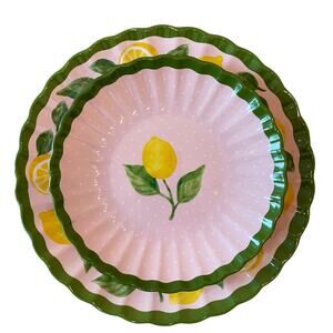 Add a fresh pop of color to your spring and summer table with this C&C California 8pc Macroom Lemons Melamine Plate Set – brand new and perfect for indoor or outdoor dining! This set includes (4) 8in salad plates and (4) 11in dinner plates featuring a charming lemon printed motif on a soft pink background with elegant scalloped edges. Made from durable melamine, they’re dishwasher-safe and ideal for everyday use or seasonal entertaining.