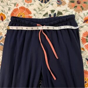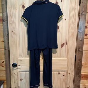 Chic navy pajama set featuring yellow and orange accents. Perfect for a cozy night in.