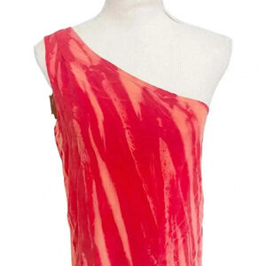 Color/print: Vivid watermelon-red with lighter vertical streaks — a bleach-dye look