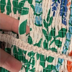 • Color/Print: Orange citrus fruit, greenery, palm trees, striped hem