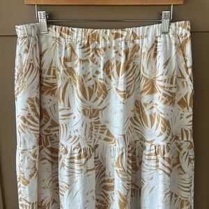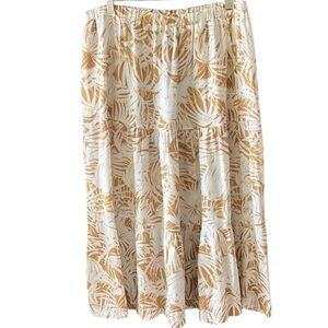 C&C California Sz L Linen Blend Pullon Tiered Midi Skirt Palm Leaf Print Tan