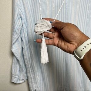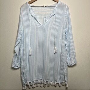 C&C California Women Linen Cotton Tunic Top Large Blue Stripe Sheer Coverup Beach Fringe Lagenlook Coastal