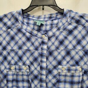 C&C California Women's Blue Plaid Roll Tab Sleeve Button Front Pocket Top Size S