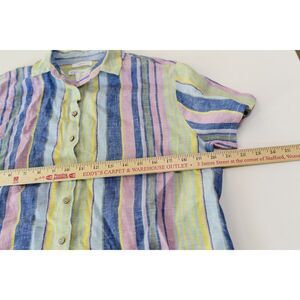 Multicolor striped pattern with a button-up front for easy wear. Crafted from 100% linen for breathable comfort. Button-Up Closure Multicolor Stripes Short Sleeves 100% Linen Made in Indonesia Non-smoking home. Check out our other listings to bundle items and save on shipping charges.