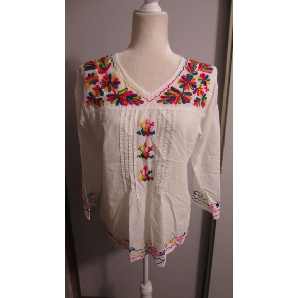 Embroidered in front and on sleeves. V neck. 3/4 sleeves. Lightweight. Chest 38". Length 24".