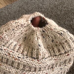 Stay warm and stylish with this cozy cream C.C knit beanie! Features a fun multi-color speckled pattern and a top ponytail hole—perfect for high buns and messy ponytails. Super soft, stretchy, and comfortable for chilly days, outdoor adventures, or casual everyday wear. Gently used and in excellent condition.