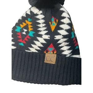 C.C Exclusive Women's Multicolor Soft Aztec Pattern Beanie with Faux Fur Pom