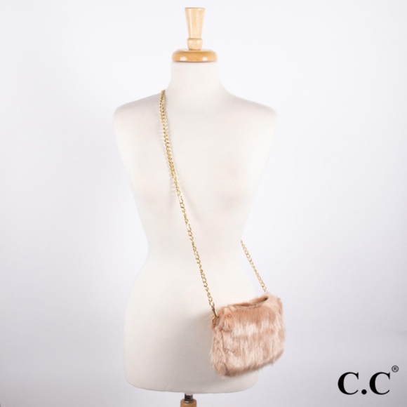 Faux Fur C.C Purse With Gold Tone Chain 9x6 Taupe