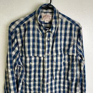 This listing is for a CC Filson Mens Long Sleeve Button Up Vented Fishing Shirt. Blue/Ivory. Pockets. Vented upper back. Poly blend.