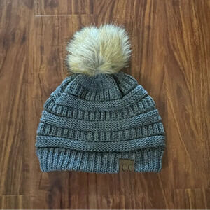 CC Grey Cable Knit Faux Fur Pom Beanie with Tan Pom Pom
